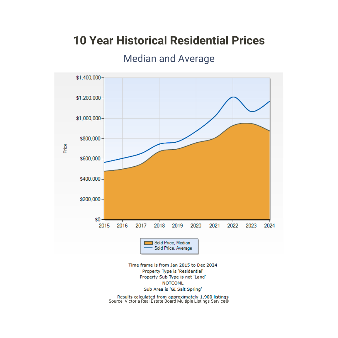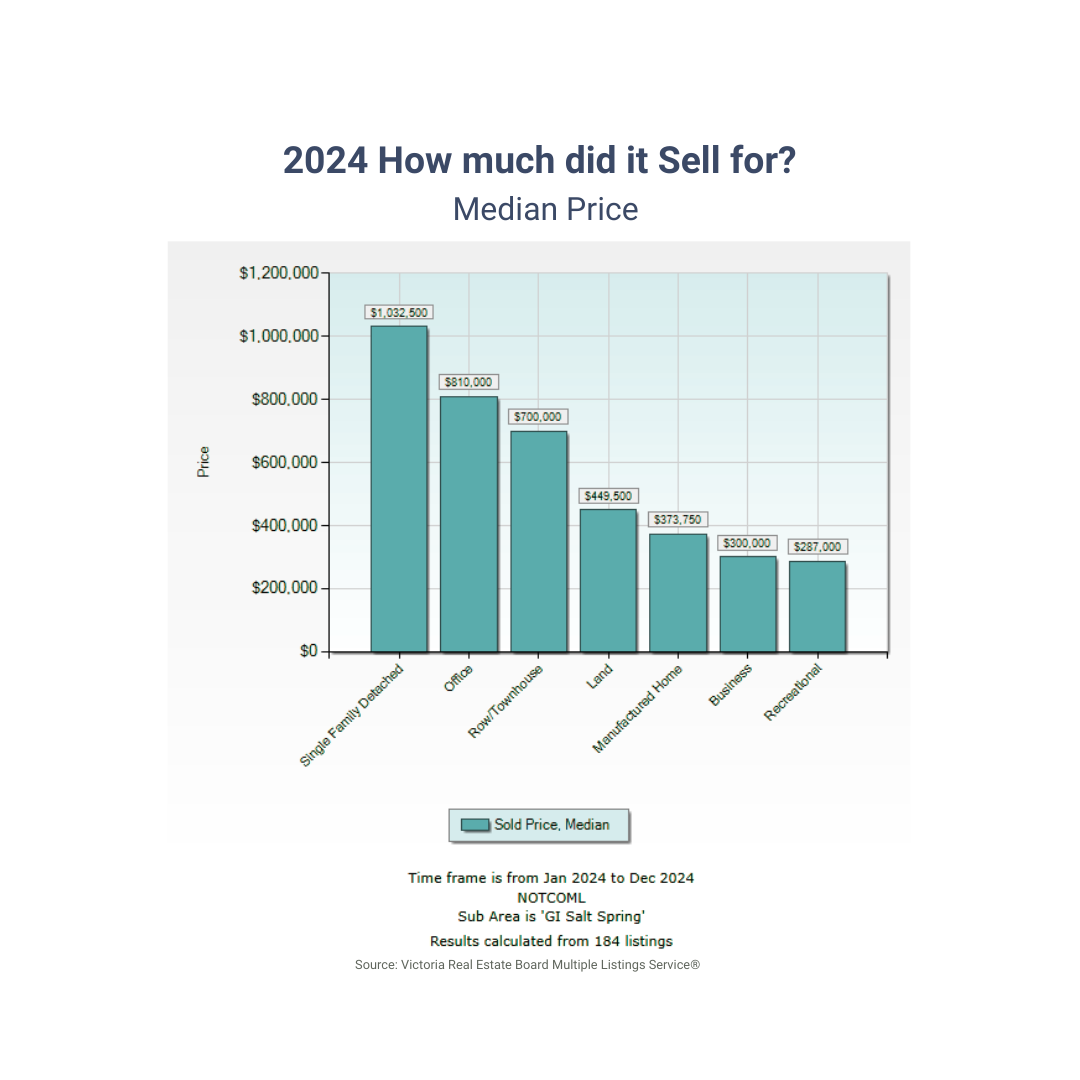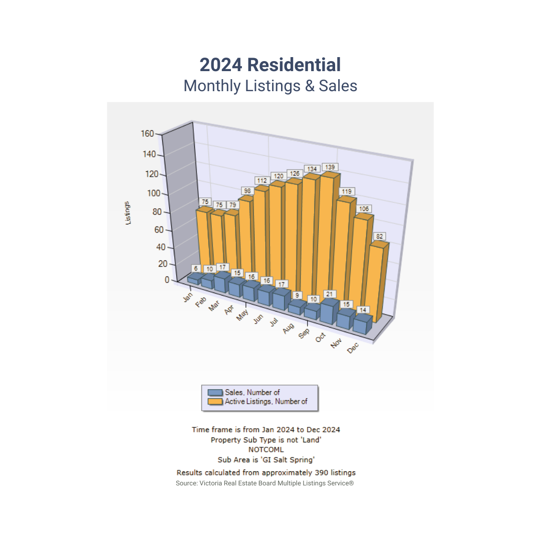 Throughout this review, you'll find the 2024 Salt Spring real estate market shown in a selection of charts and graphs. Our findings are primarily sourced from the Victoria Real Estate Board’s multiple listing service—providing a comprehensive portrayal of Salt Spring’s market conditions. Note that our data may not include every transaction, as we are excluding listings from other boards, exclusive listings, and direct (private) sales.