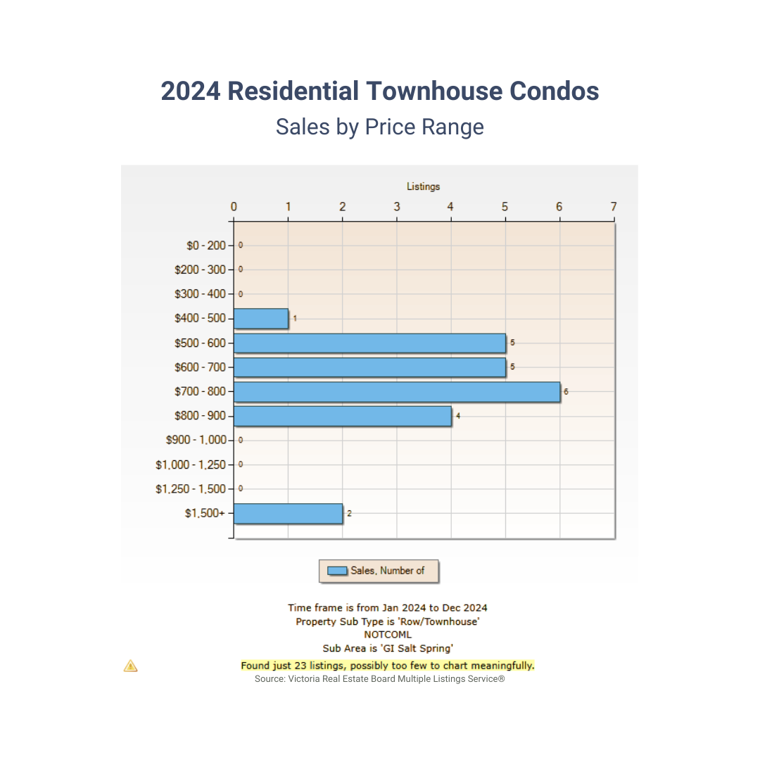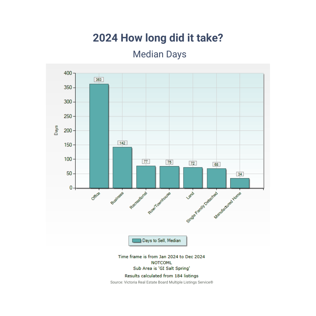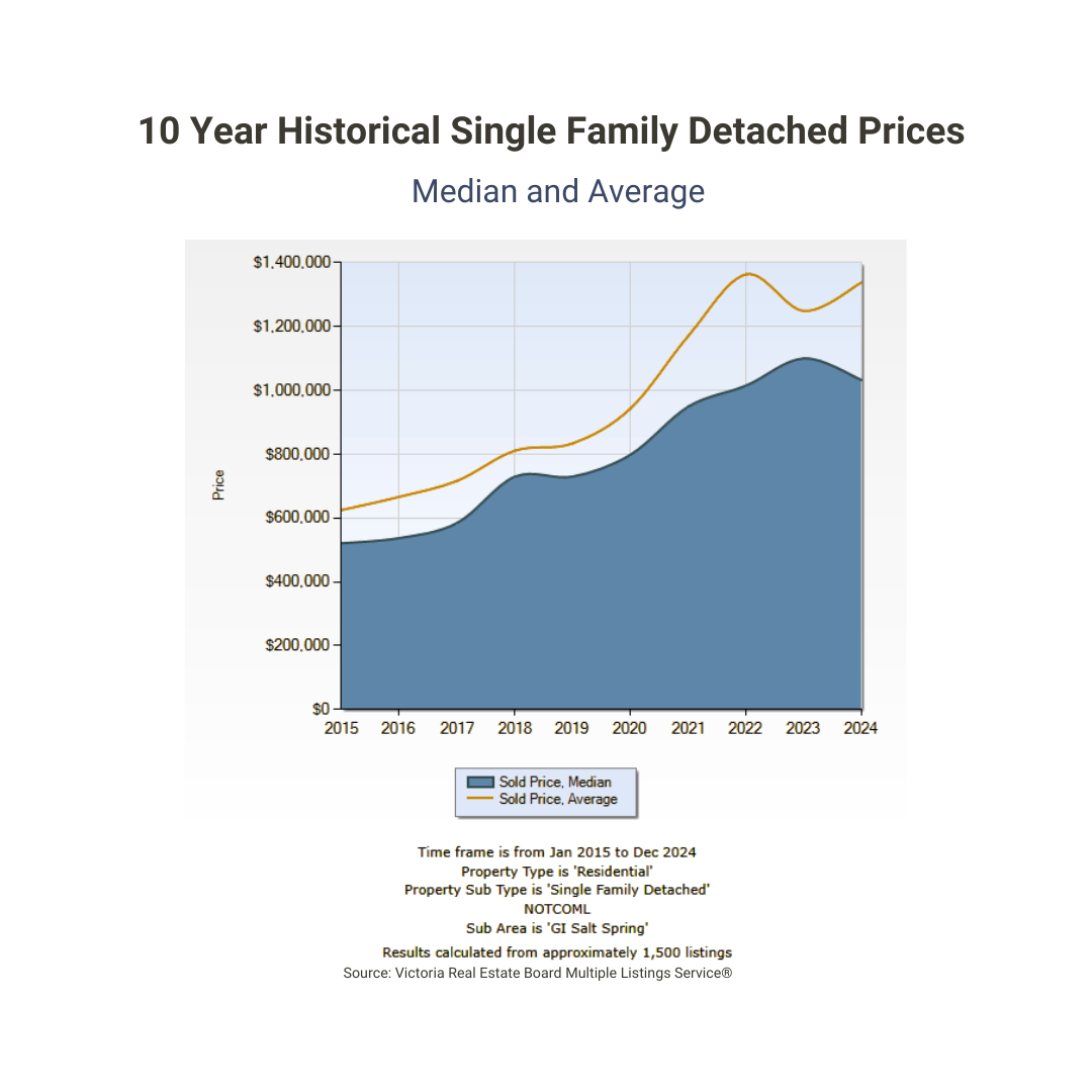 Throughout this review, you'll find the 2024 Salt Spring real estate market shown in a selection of charts and graphs. Our findings are primarily sourced from the Victoria Real Estate Board’s multiple listing service—providing a comprehensive portrayal of Salt Spring’s market conditions. Note that our data may not include every transaction, as we are excluding listings from other boards, exclusive listings, and direct (private) sales.