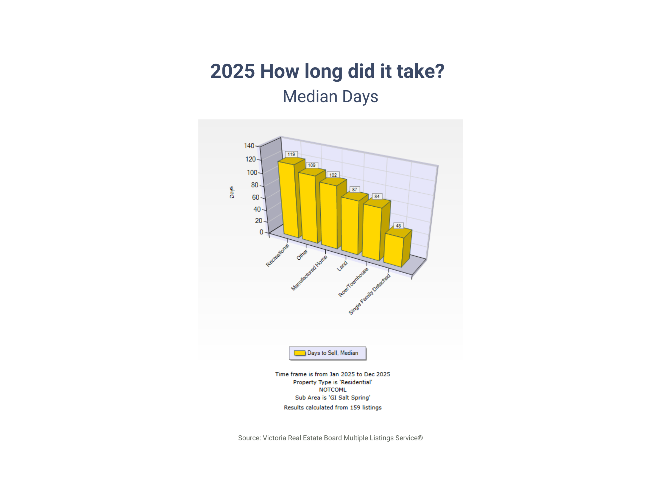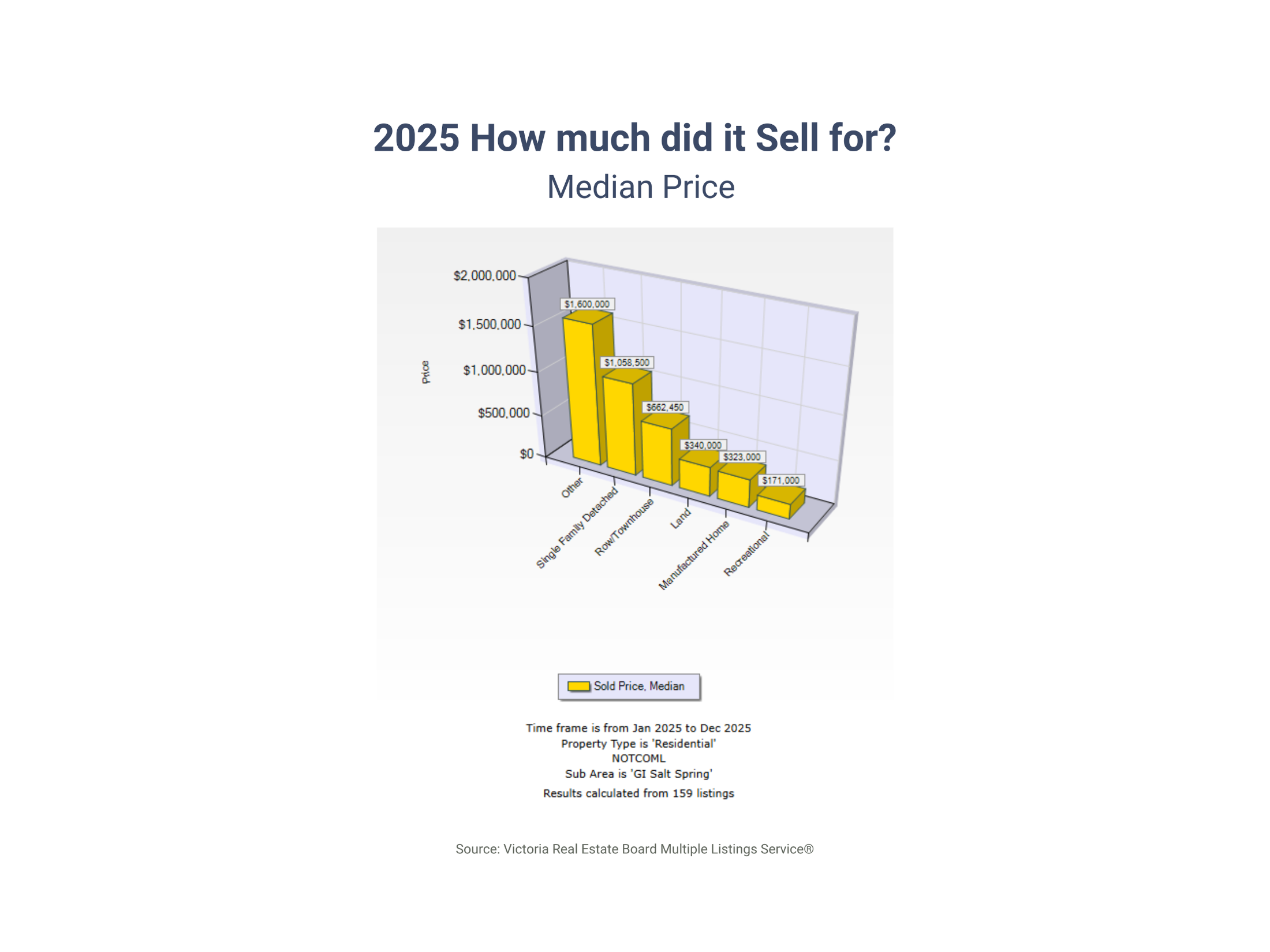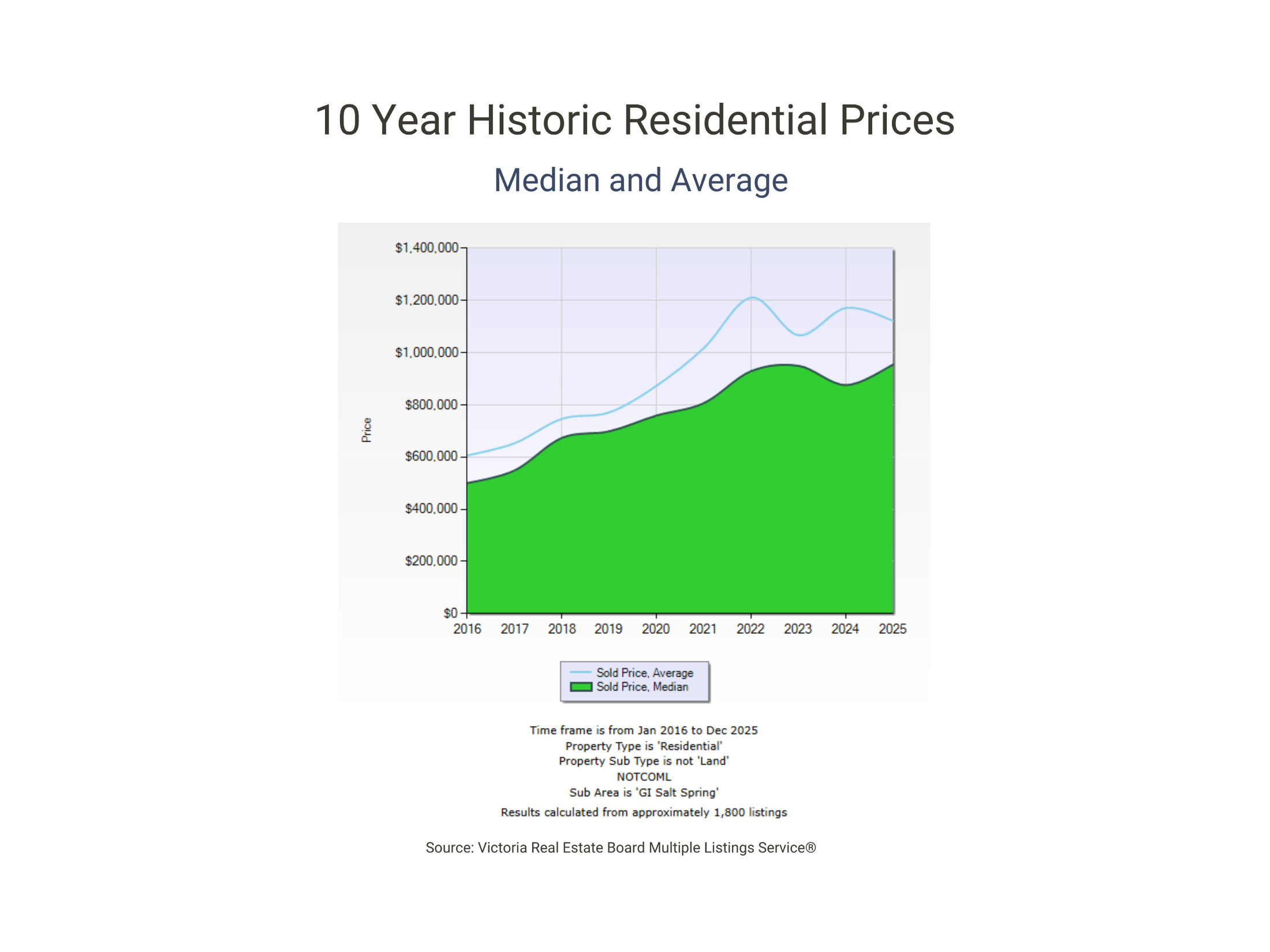 2025 was a year of stabilization and selective growth in Salt Spring Island’s real estate market. Given the Island’s small and highly individualized market, median prices provide the most reliable insight, as a few high- or low-value sales can skew averages. This report combines median pricing, sales volume, days on market, and 10-year trends with property-type and oceanfront data to give a comprehensive market overview.